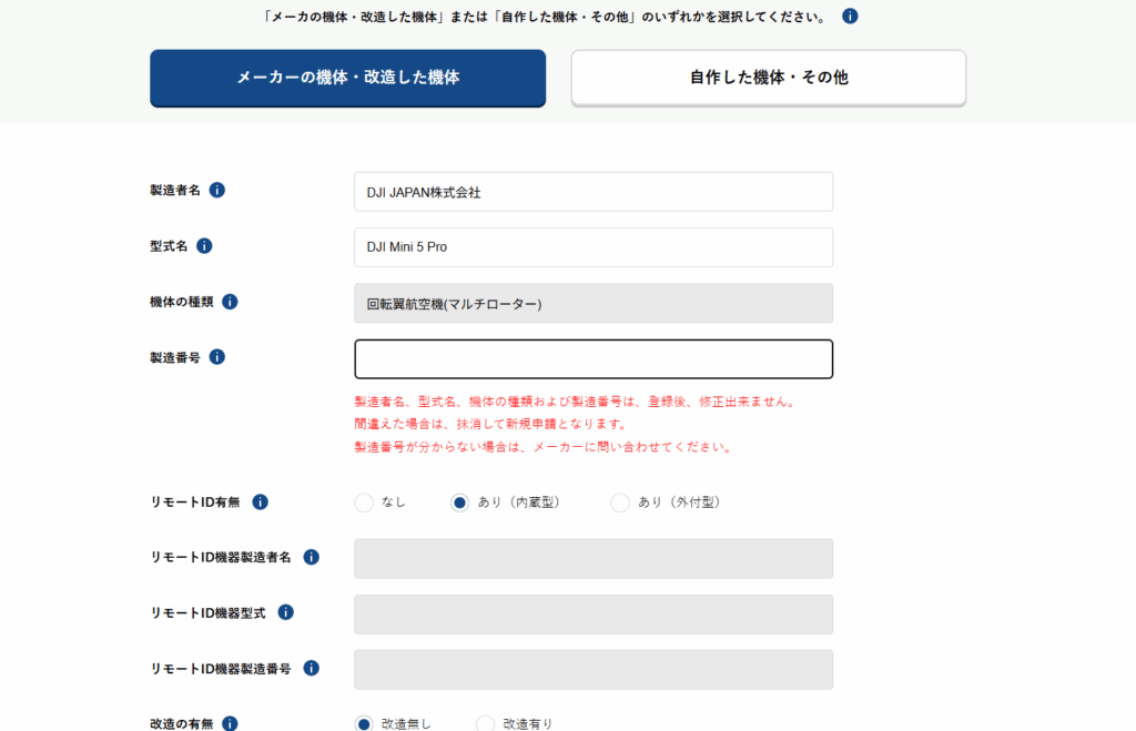 製造者名選択で、DJIを選ぶとこの機体は出てこなかったので、試しにDJI JAPAN株式会社にしてみたところ、DJI Mini 5 proが表示されました。