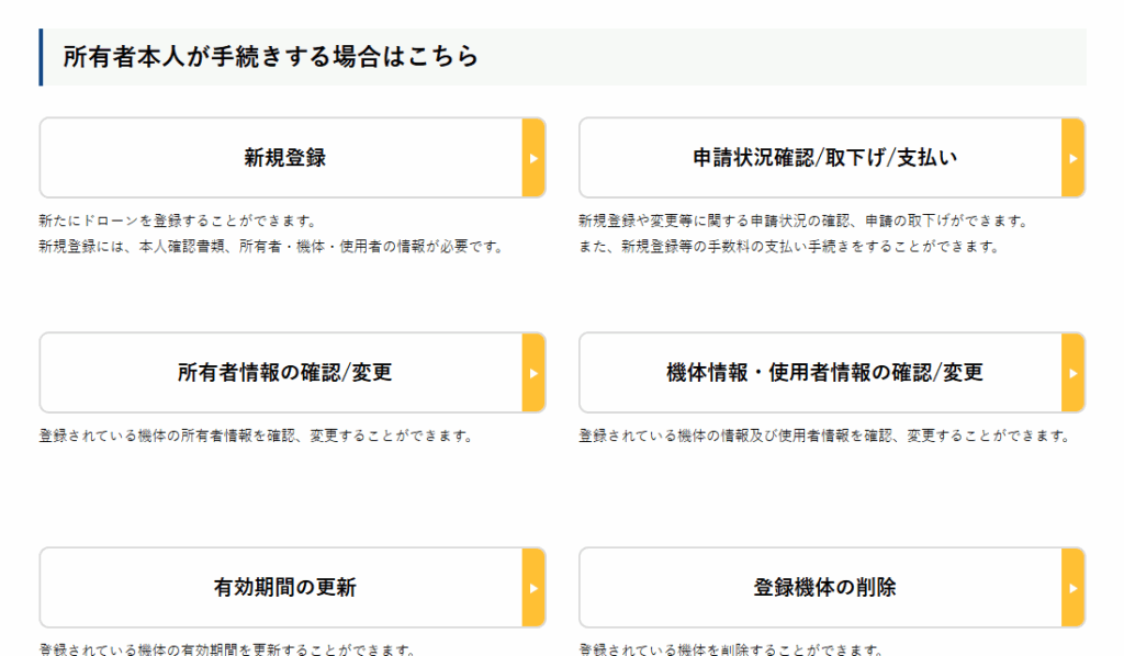 検索で「ドローン 機体登録」などと検索すれば国交省の無人航空機登録ポータルサイトが出てくると思いますので、そちらからオンラインで登録という項目をクリックすると上の画像のような画面になると思います。